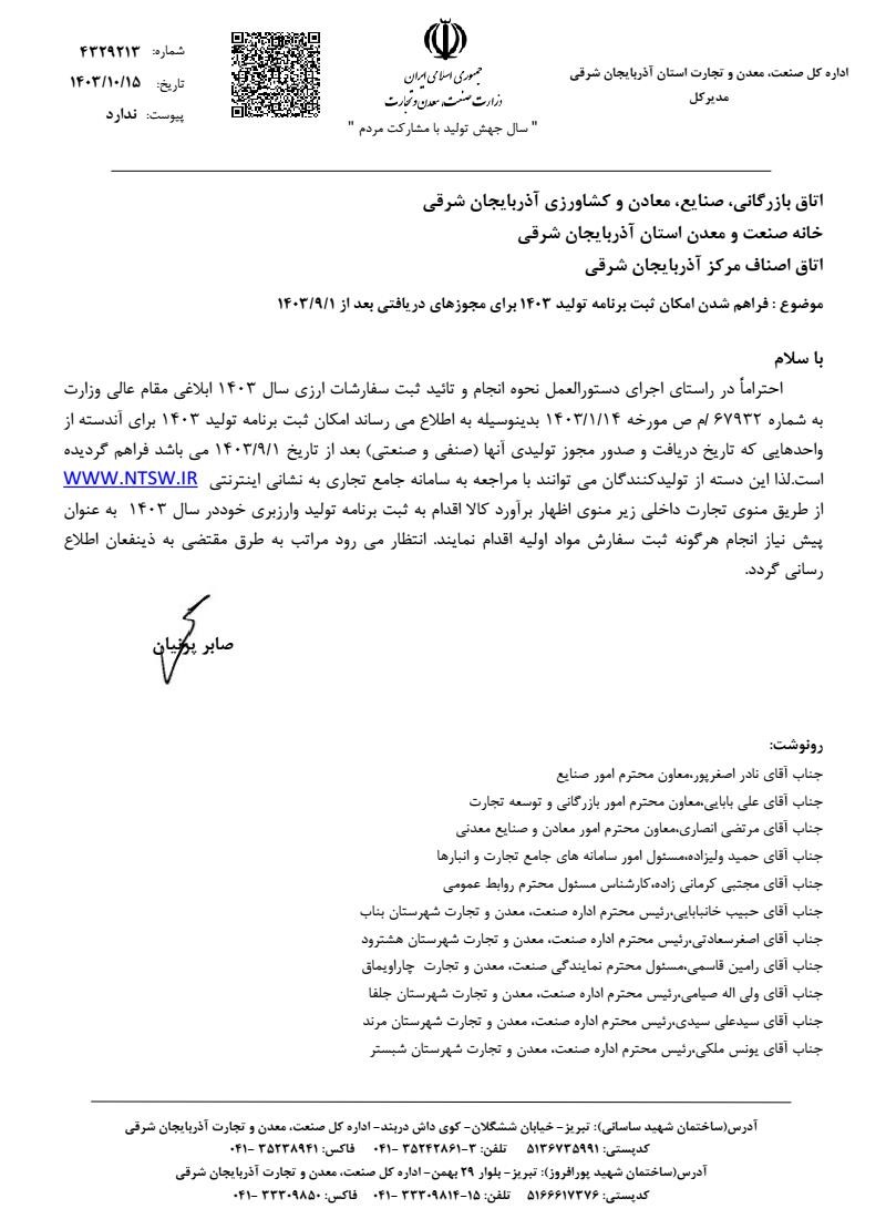 در راستای اجرای دستورالعمل نحوه انجام و تائید ثبت سفارشات ارزی سال ۱۴۰۳ بدین وسیله به اطلاع می رساند امکان ثبت برنامه تولید ۱۴۰۳ برای آن دسته از واحدهایی که تاریخ دریافت و صدور مجوز تولیدی آنها (صنفی و صنعتی) بعد از تاریخ ۱۴۰۳/۹/۱ میباشد، فراهم گردیده است.