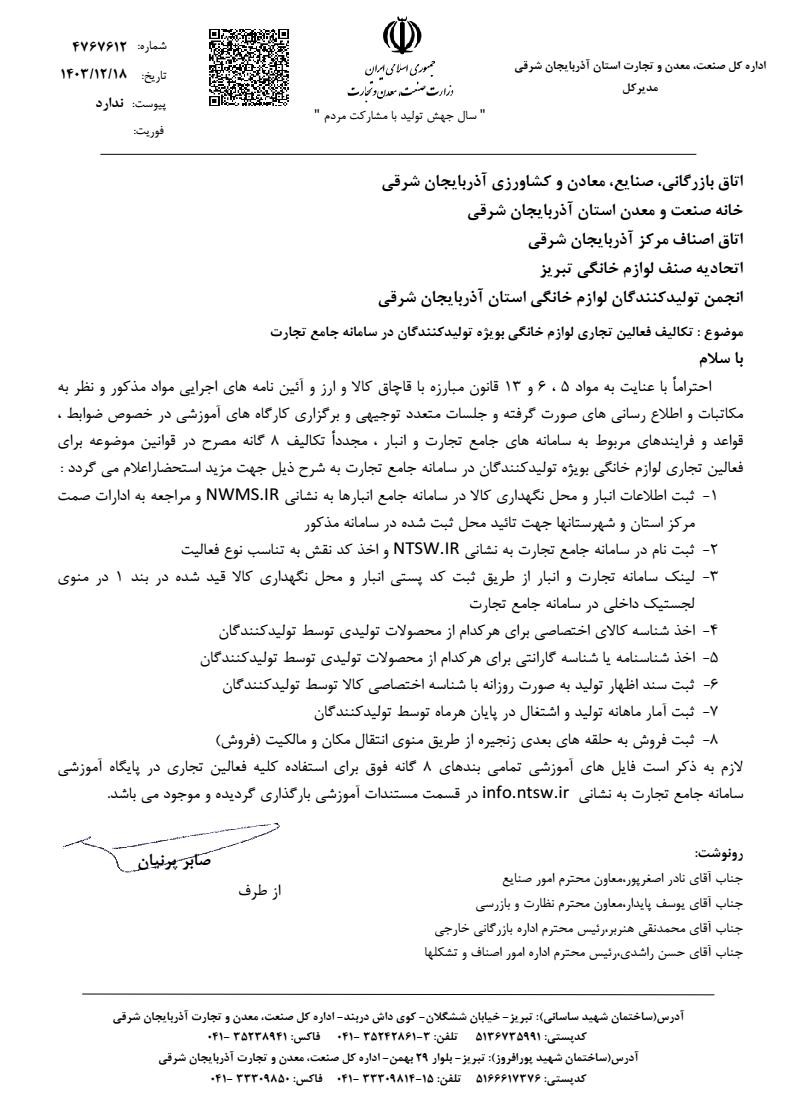 احتراماً با عنایت به مواد ۵ ، 6، ۱۳ قانون مبارزه با قاچاق کالا و ارز و آئین نامه‌های اجرایی مواد مذکور و نظر به مکاتبات و اطلاع رسانی های صورت گرفته و جلسات متعدد توجیهی و برگزاری کارگاه‌های آموزشی در خصوص ضوابط، قواعد و فرایندهای مربوط به سامانه های جامع تجارت و انبار، مجدداً تکالیف ۸ گانه مصرح در قوانین موضوعه برای فعالان تجاری لوازم خانگی به‌ویژه تولیدکنندگان در سامانه جامع تجارت اعلام می شود.