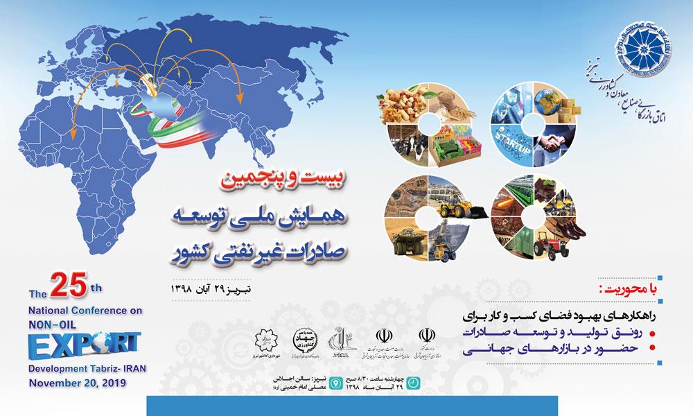 بیست و پنجمین همایش ملی توسعه صادرات غیر نفتی کشور در تاریخ ۲۹ آبان ماه ۱۳۹۸ توسط اتاق بازرگانی، صنایع، معادن و کشاورزی استان در شهر تبریز برگزار خواهد شد.