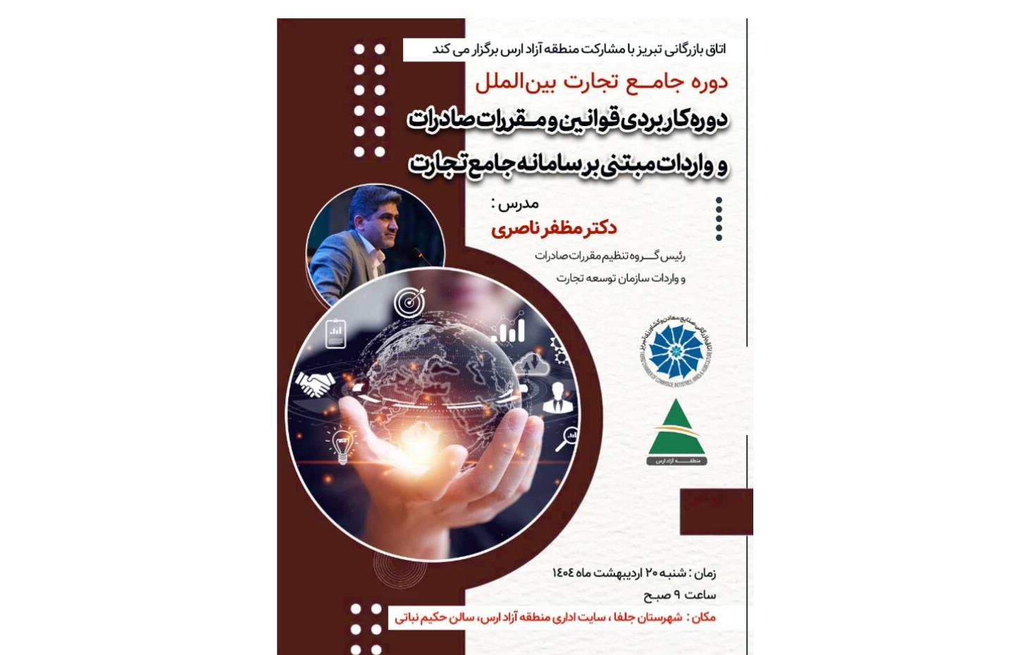 دوره آموزشی تبیین قوانین و مقررات صادرات و واردات (دوره جامع تجارت بینالملل) با تدریس دکتر مظفر ناصری؛ رئیس گروه تنظیم مقررات صادرات و واردات سازمان توسعه تجارت، ساعت 9 صبح روز شنبه 20 اردیبهشت ماه 1404، در شهرستان جلفا، سایت اداری منطقه آزاد ارس، سالن حکیم نباتی برگزار می شود.
