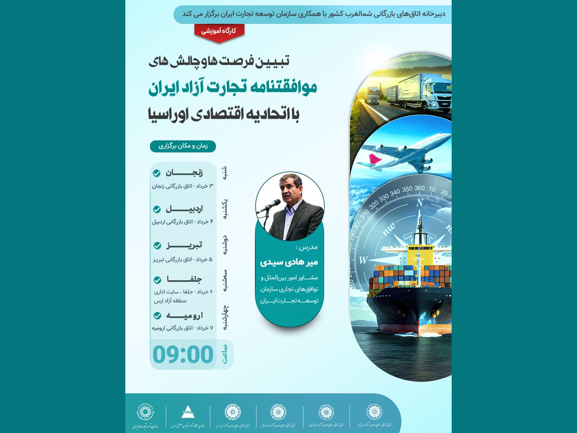 کارگاه آموزشی تبیین فرصتها و چالشهای موافقتنامه تجارت آزاد ایران با اتحادیه اقتصادی اوراسیا، به همت دبیرخانه اتاقهای شمالغرب کشور از تاریخ 3 الی 7 خرداد ماه سال 1404 برگزار میشود.