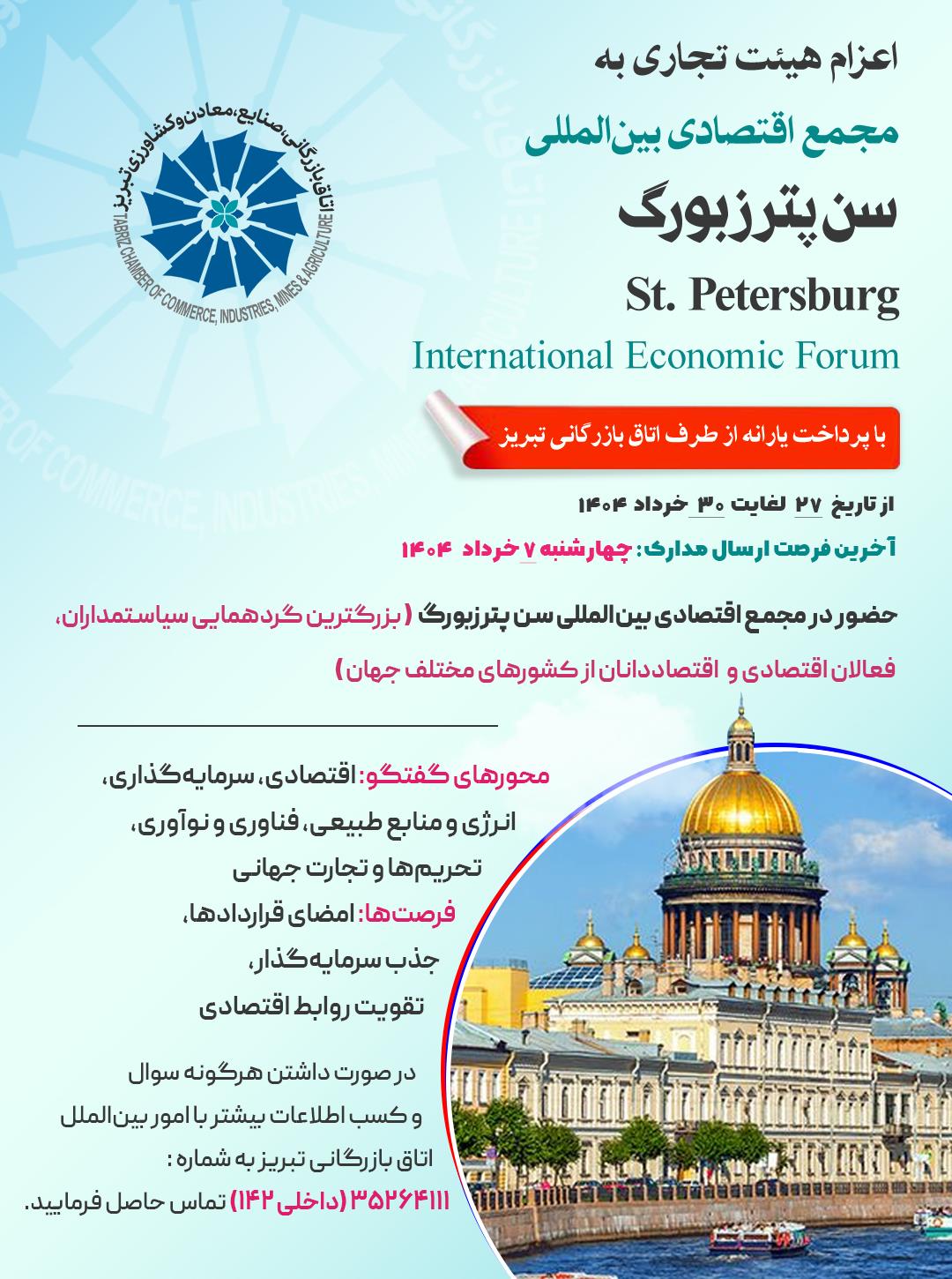 به استحضار اعضای محترم اتاق بازرگانی، صنایع، معادن و کشاورزی تبریز می‌رساند، این اتاق در نظر دارد هیئتی متشکل از بازرگانان و صاحبان صنایع را از تاریخ 27 لغایت 30 خرداد ماه سالجاری جهت حضور در  مجمع اقتصادی بین‌المللی سن پترزبورگ St. Petersburg International Economic Forum به کشور فدراسیون روسیه اعزام کند.