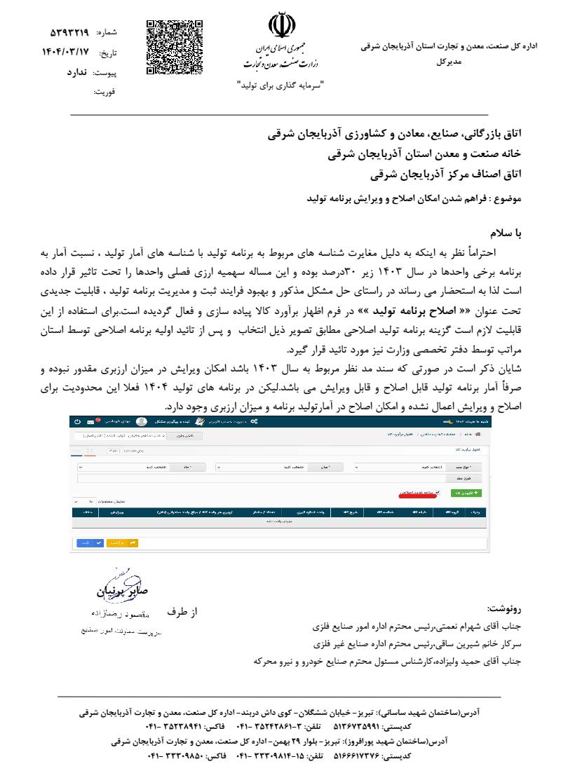 با توجه به اینکه به دلیل مغایرت شناسه های مربوط به برنامه تولید با شناسه های آمار تولید، نسبت آمار به برنامه برخی واحدها در سال ۱۴۰۳ زیر ۳۰ درصد بوده و این مساله سهمیه ارزی فصلی واحدها را تحت تاثیر قرار داده است، لذا به استحضار میرساند در راستای حل مشکل مذکور و بهبود فرایند ثبت و مدیریت برنامه تولید، قابلیت جدیدی تحت عنوان «اصلاح برنامه تولید» در فرم اظهار برآورد کالا پیاده سازی و فعال گردیده است. برای استفاده از این قابلیت لازم است گزینه برنامه تولید اصلاحی مطابق تصویر ذیل انتخاب و پس از تائید اولیه برنامه اصلاحی توسط استان مراتب توسط دفتر تخصصی وزارت نیز مورد تائید قرار گیرد.