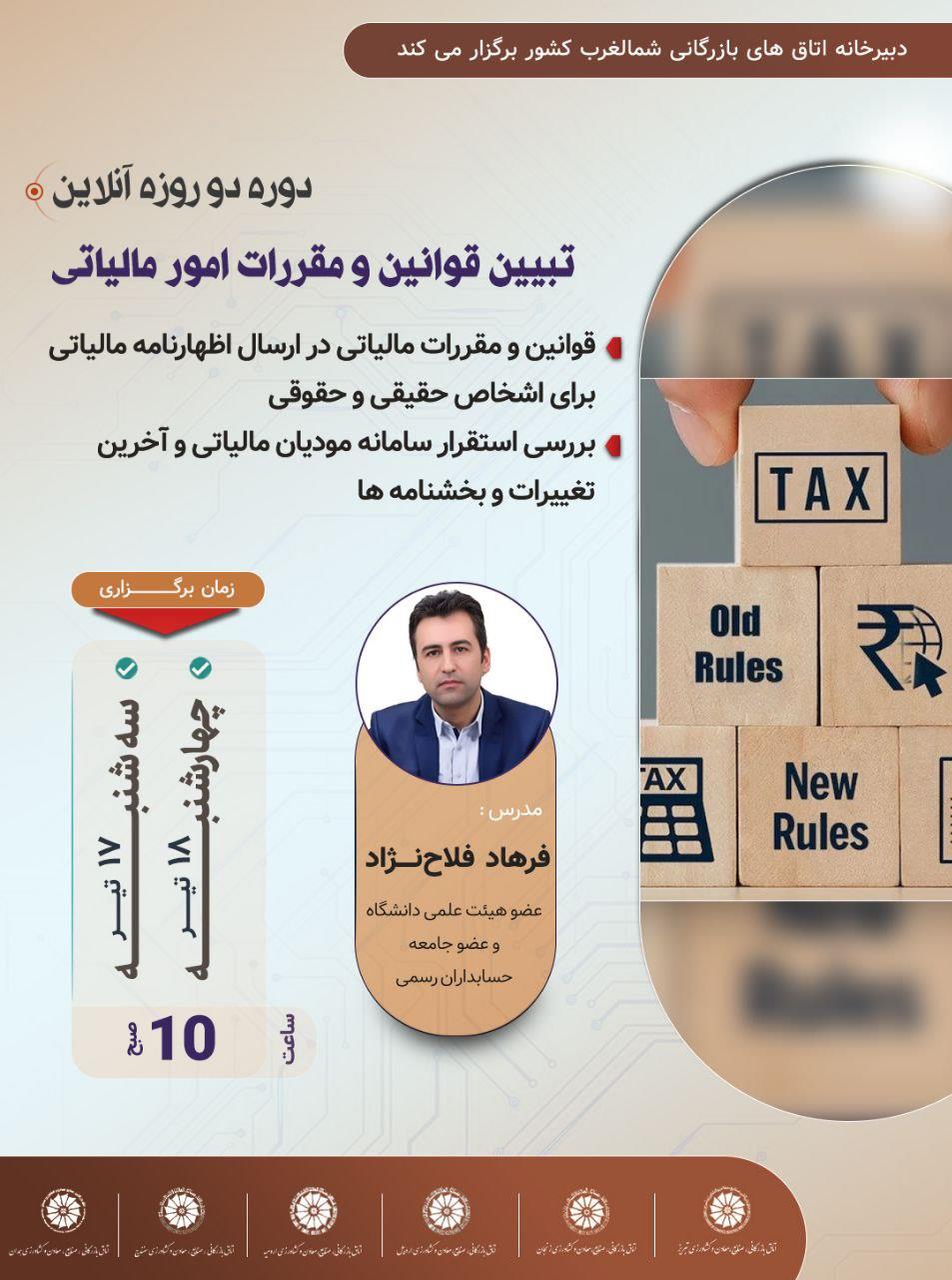 دوره آموزشی آنلاین 2 روزه تبیین قوانین و مقررات امور مالیاتی به همت دبیرخانه اتاقهای بازرگانی شمالغرب کشور برگزار میشود.