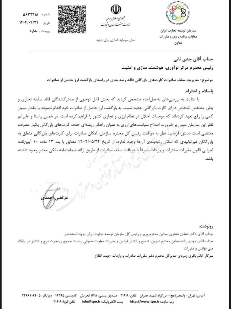 بر اساس اعلام سازمان توسعه تجارت، امكان صادرات براي كارتهاي بازرگاني متعلق به بازرگانان غير توليدي كه امكان رتبه‌بندي آنها وجود ندارد، از تاريخ 1404/٠٥/24 مطابق با بند ١٣ ماده  ١٠ آيين نامه اجرايي قانون مقررات صادرات و واردات صرفاً با دريافت سقف صادرات از طريق ارائه ضمانت نامه بانكي معتبر وجود دارد.