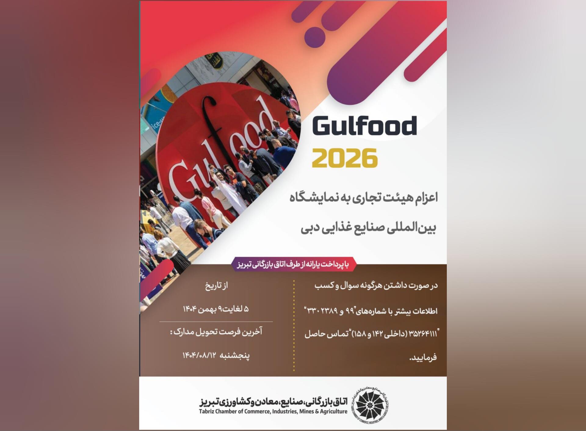 اتاق تبریز در نظر دارد، هیئتی متشکل از بازرگانان و صاحبان صنایع را از تاریخ 5 لغایت 9 بهمن ماه سال جاری، جهت بازدید از نمایشگاه صنایع غذایی دبی Gulfood 2026 که بزرگترین نمایشگاه صنایع خوراکی و آشامیدنی جهان است، اعزام کند.