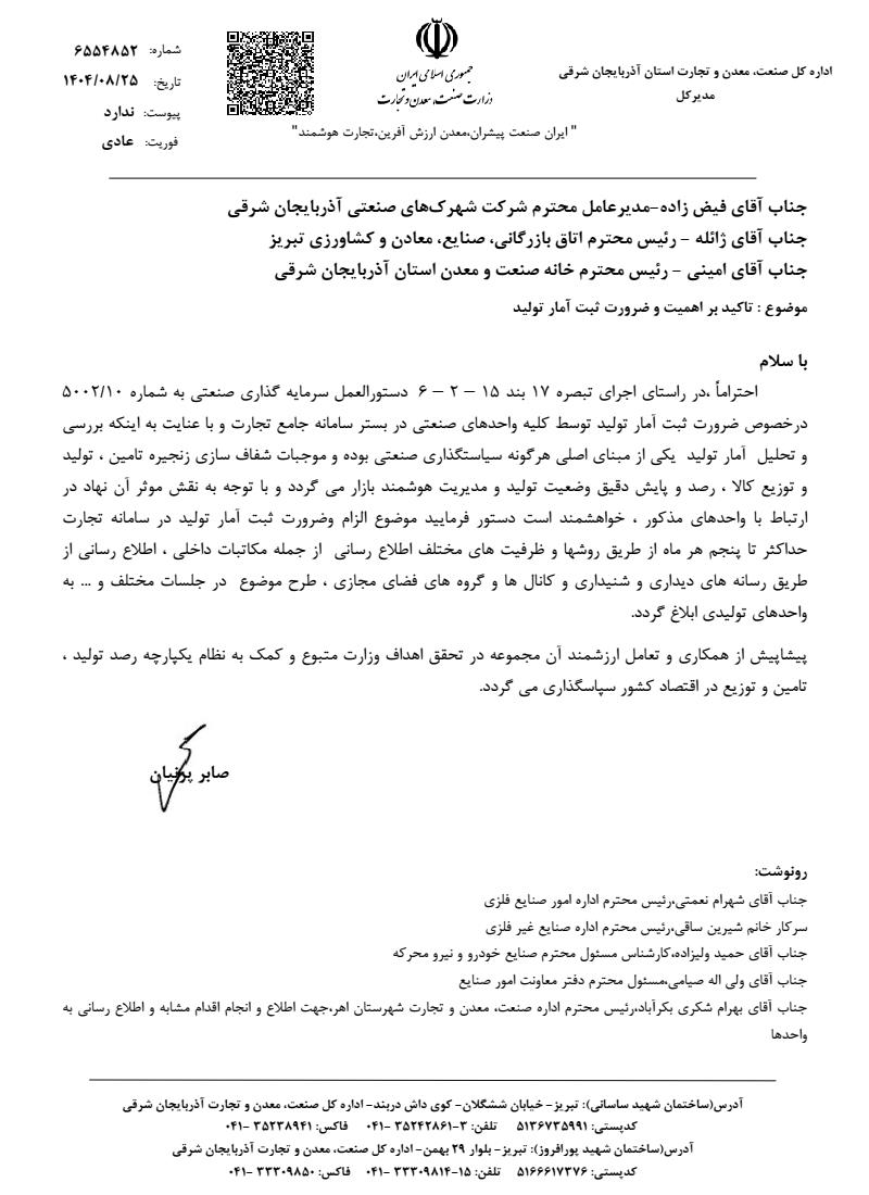 با توجه به اهمیت ثبت و پایش آمار تولید در فرآیند سیاستگذاری صنعتی، ثبت آمار تولید در سامانه جامع تجارت برای کلیه واحدهای صنعتی الزامی بوده و این اطلاعات مبنای اصلی شفافسازی زنجیره تأمین، تولید و توزیع کالا، همچنین رصد دقیق وضعیت تولید و مدیریت هوشمند بازار خواهد بود، لذا بدینوسیله تأکید میشود که واحدهای صنعتی موظفاند آمار تولید ماهیانه خود را حداکثر تا پنجم هر ماه در سامانه جامع تجارت ثبت کنند.