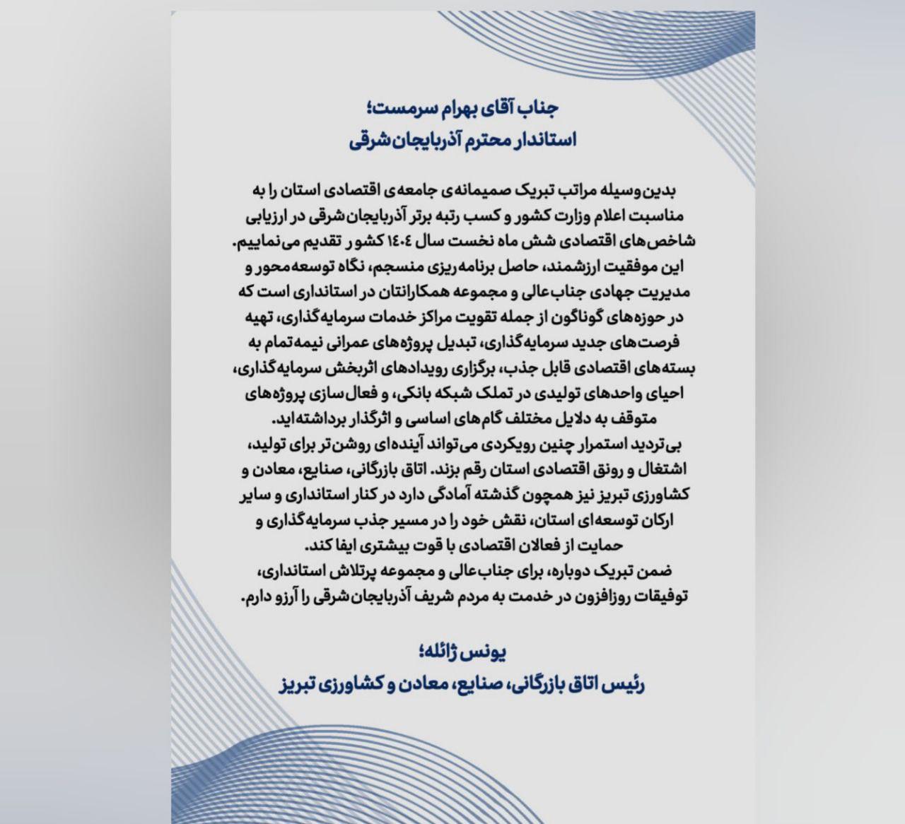 در متن پیام چنین آمده است: «بدینوسیله مراتب تبریک صمیمانهی جامعهی اقتصادی استان را به مناسبت اعلام وزارت کشور و کسب رتبه برتر آذربایجانشرقی در ارزیابی شاخصهای اقتصادی شش ماه نخست سال 1404 کشور تقدیم مینماییم.