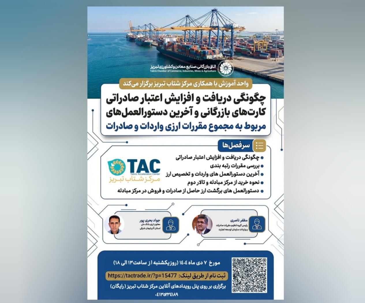 وبینار چگونگی دریافت و افزایش اعتبار صادراتی کارتهای بازرگانی و آخرین دستورالعملهای مربوط به مجموع مقررات ارزی واردات و صادرات، به همت واحد آموزش اتاق تبریز با همکاری مرکز شتاب تبریز برگزار میشود.