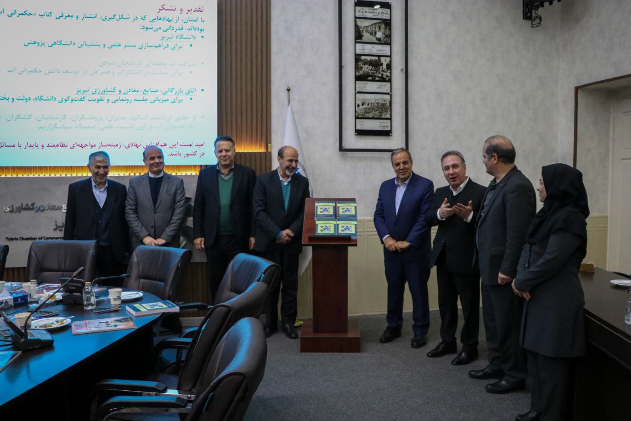 نشست رونمایی و معرفی کتاب «حکمرانی آب» با حضور جمعی از اساتید، پژوهشگران و علاقهمندان حوزه سیاستگذاری و منابع طبیعی در اتاق بازرگانی تبریز برگزار شد. در این نشست، داوود بهبودی، استاد گروه توسعه اقتصادی و برنامهریزی دانشگاه تبریز، فهیمه قربانی، دکترای اقتصاد با گرایش منابع طبیعی و محیط زیست، و محمد عباسزاده، معاون پژوهشی دانشکده حقوق و علوم اجتماعی، بهعنوان سخنرانان اصلی به تبیین ابعاد نظری، اقتصادی، اجتماعی و حقوقی حکمرانی آب پرداختند.