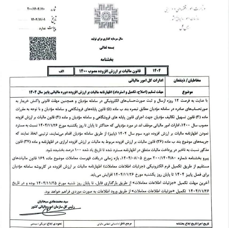 بر اساس بخشنامه مالیاتی مورخ اول بهمن ماه سال جاری ، مهلت تسلیم ( اصلاح، تکمیل و استرداد) اظهارنامه مالیات بر ارزش افزوده مربوط به دوره مالیاتی پاییز سال 1404 تمدید شد.