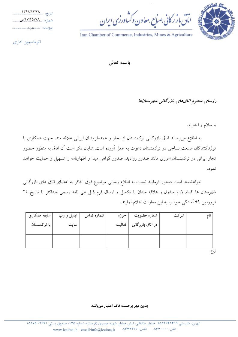 طبق نامه امور بین الملل اتاق ایران، اتاق بازرگانی ترکمنستان از تجار و عمده فروشان ایرانی جهت همکاری با تولیدکنندگان صنعت نساجی در ترکمنستان دعوت بعمل آورده است.