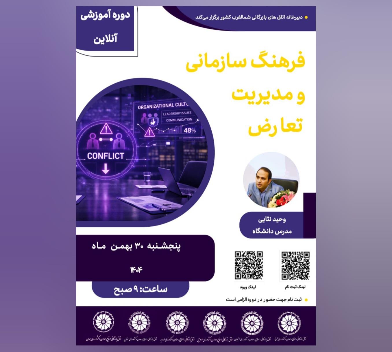 وبینار آموزشی فرهنگ سازمانی و مدیریت تعارض به همت دبیرخانه اتاقهای بازرگانی شمالغرب کشور برگزار میشود.