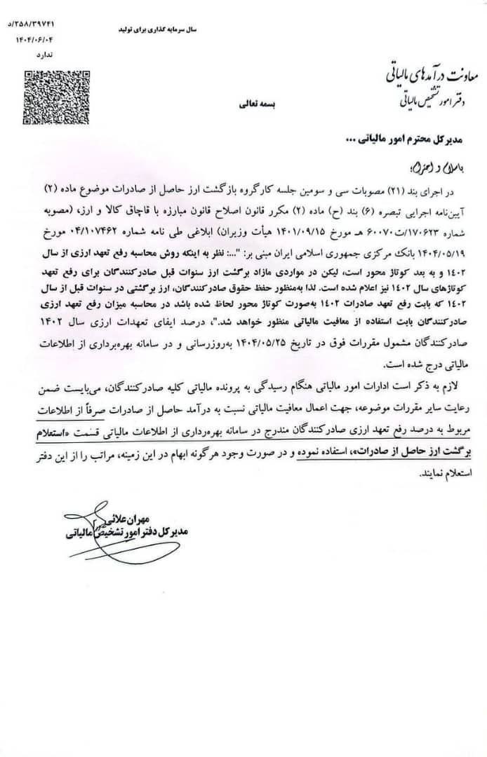 با توجه به اینکه روش محاسبه رفع تعهد ارزی از سال ۱۴۰۲ کوتاژمحور است لیکن در مواردی مازاد برگشت ارز از سنوات قبل صادرکنندگان برای رفع تعهد کوتاژهای سال ۱۴۰۲ نیز اعلام شده است، لذا به منظور حفظ حقوق صادرکنندگان ارز برگشتی در سنوات قبل از سال ۱۴۰۲ که بابت رفع تعهد صادرات ۱۴۰۲ بصورت کوتاژمحور لحاظ شده باشد، در محاسبه میزان رفع تعهد ارزی صادرکنندگان بابت استفاده از معافیت مالیاتی منظور خواهد شد.