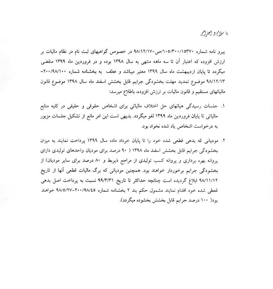 اعلام تمدید گواهیهای مالیات بر ارزش افزوده تا آخر اردیبهشت 99