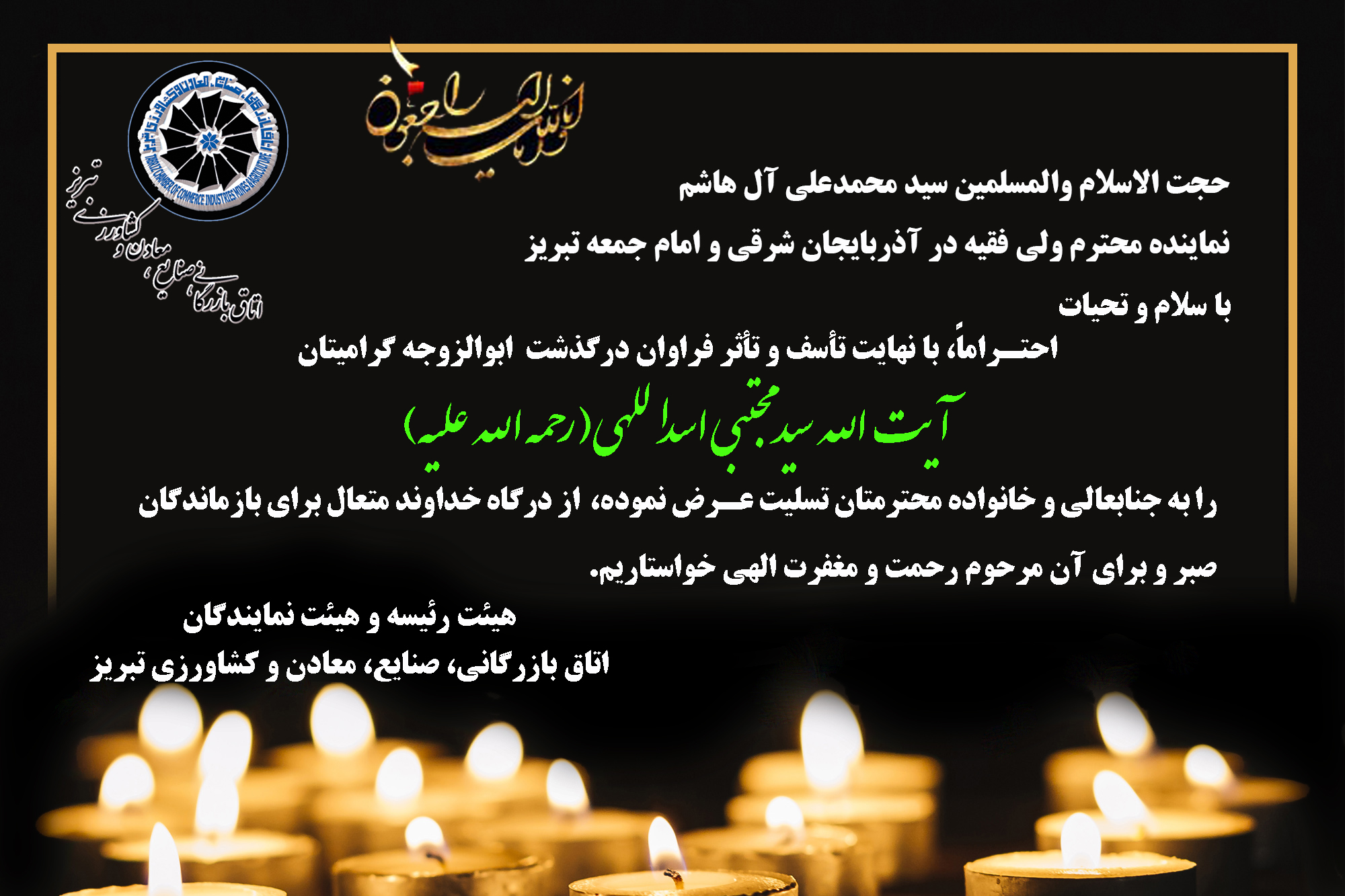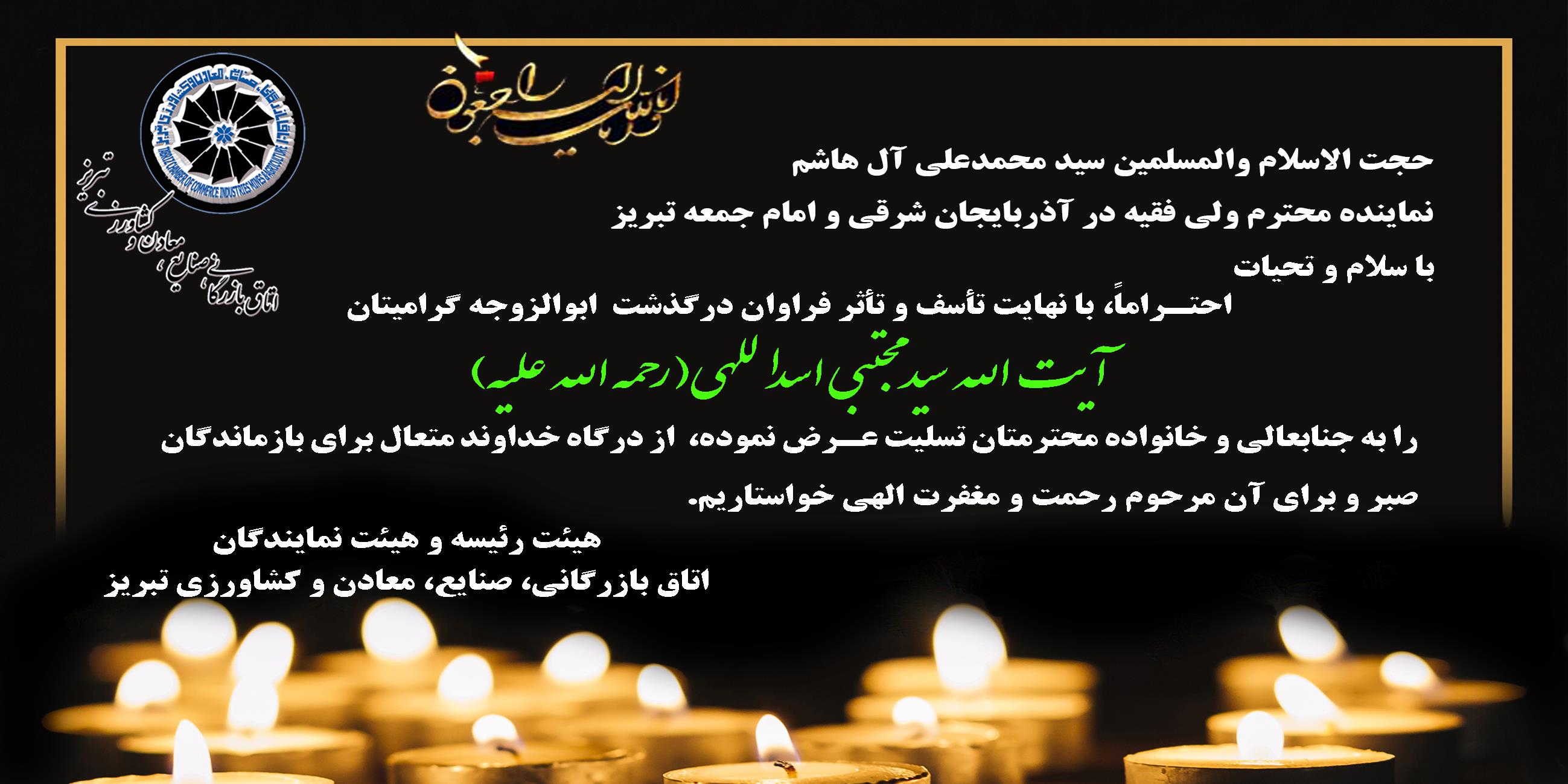 مراتب تسلیت هیئت رئیسه و نمایندگان اتاق بازرگانی تبریز به حضور محترم حجتالاسلام و المسلمین سیدمحمدعلی آلهاشم نماینده محترم ولی فقیه در آذربایجان شرقی و امام جمعه تبریز اعلام گردید.