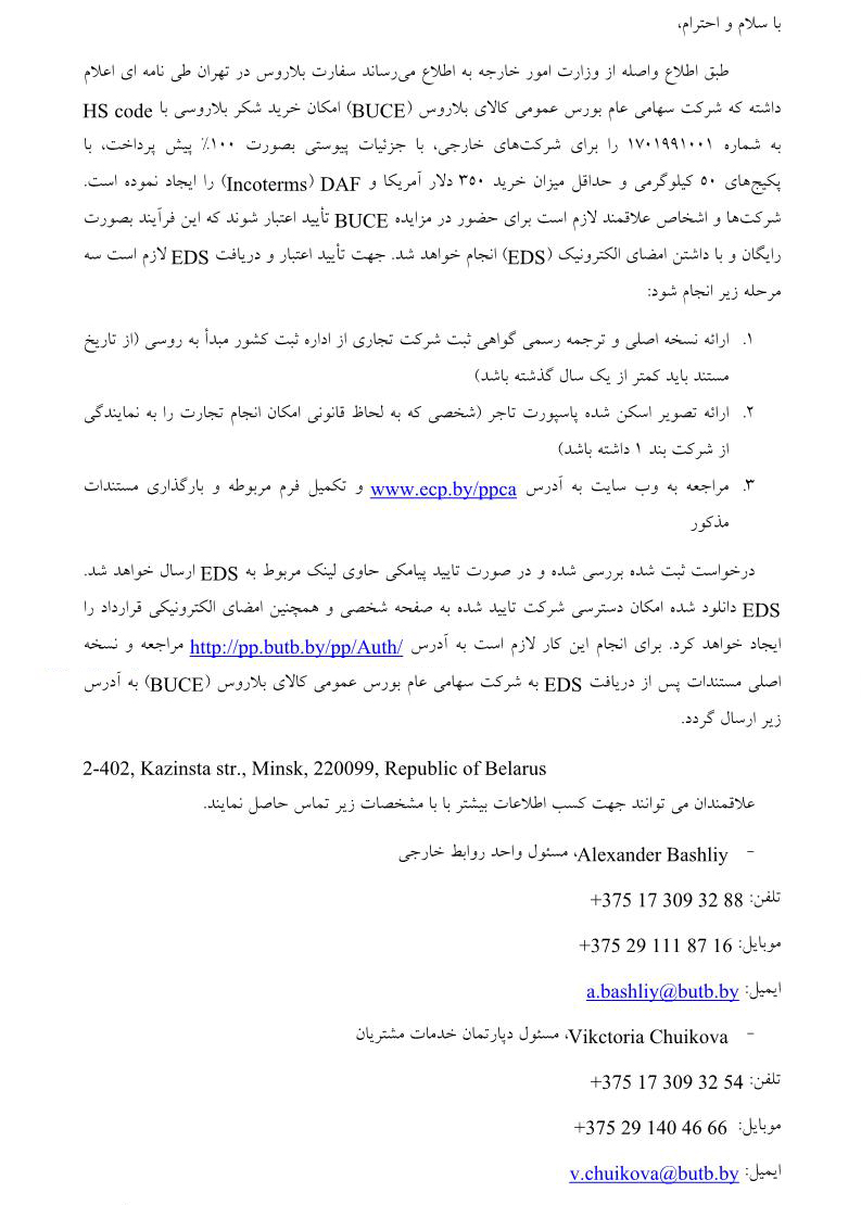 پیشنهاد شرکت سهامی عام بورس عمومی کالای بلاروس برای خرید شکر بلاروسی