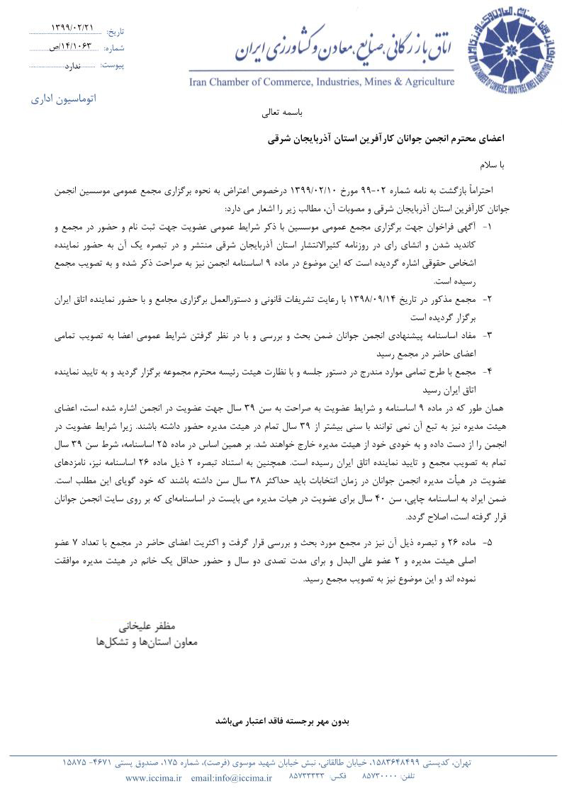 تایید انتخابات انجمن جوانان اتاق تبریز توسط اتاق ایران و مخالفت با درخواست برگزاری مجدد این انتخابات