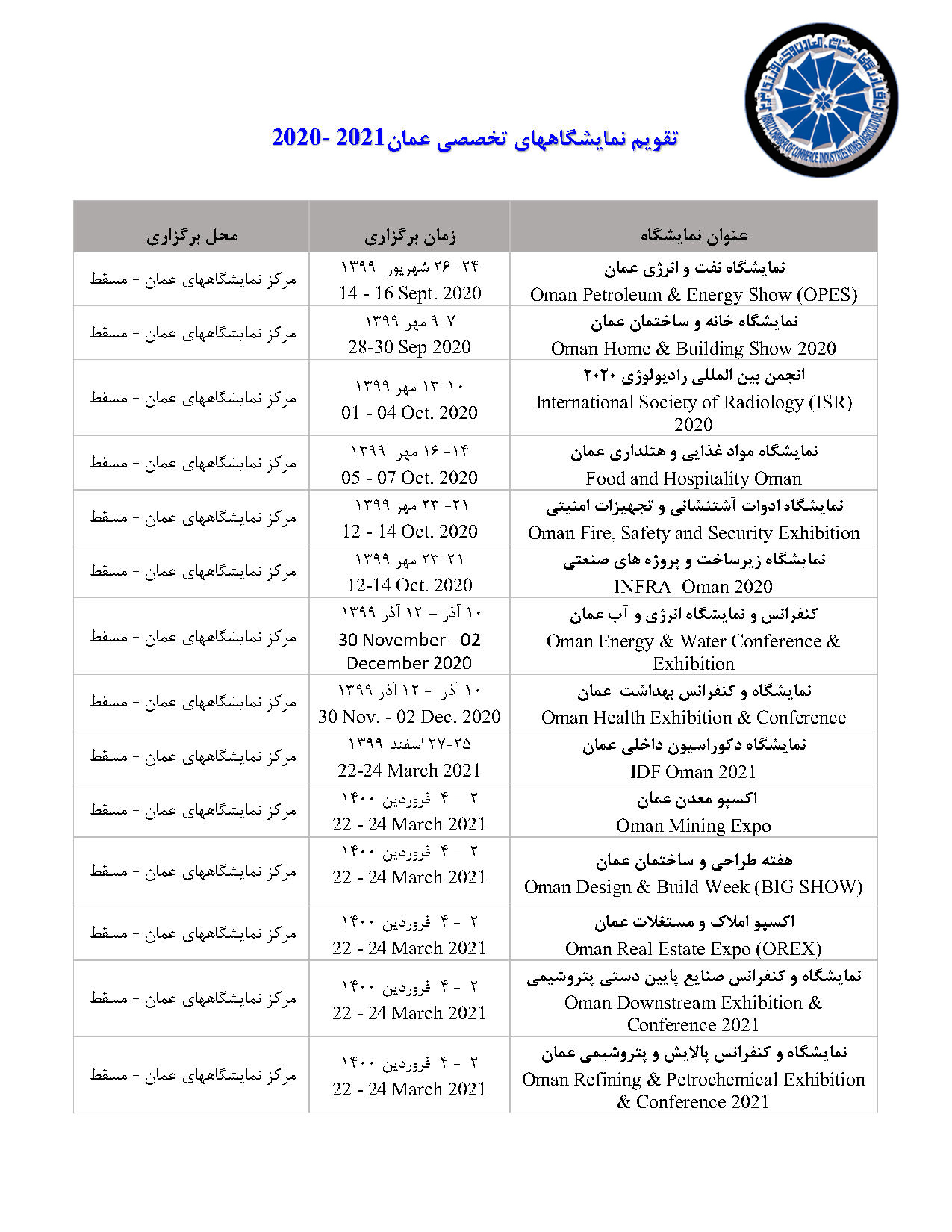 تقویم نمایشگاههای تخصصی عمان در سال 2020 و 2021