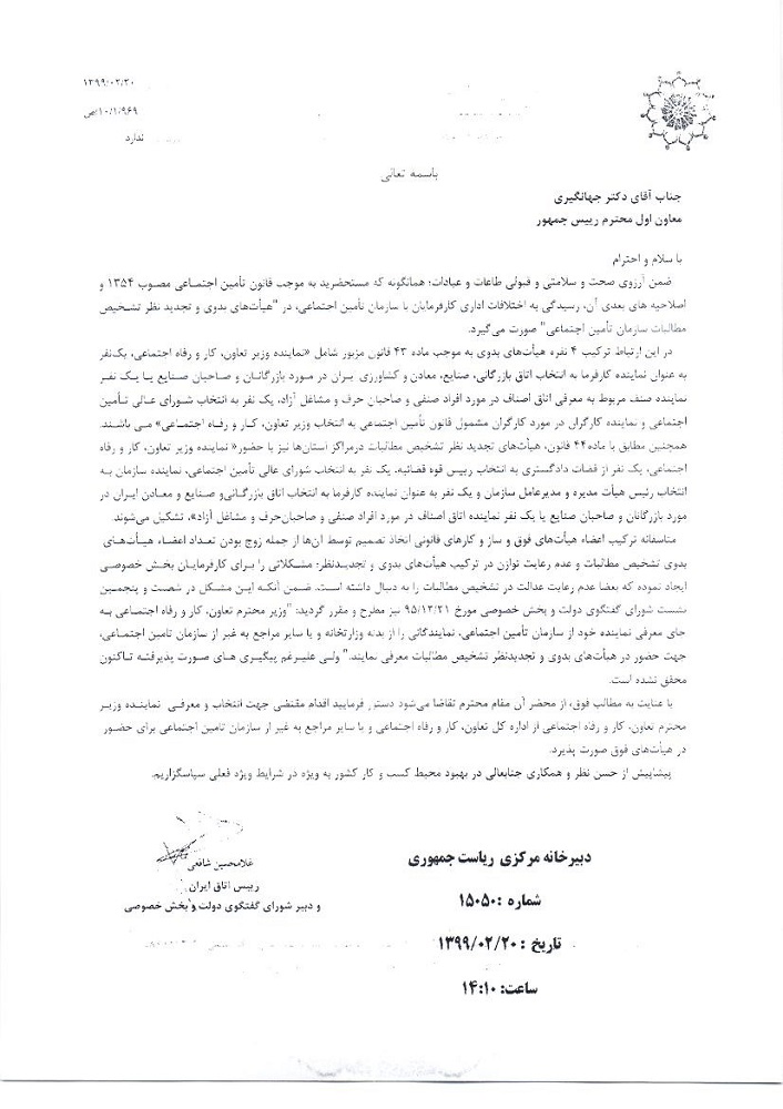 رئیس اتاق ایران در نامهای که 20 اردیبهشت 99 به معاون اول رئیسجمهور نوشت، با اشاره به اینکه مشکلاتی که ترکیب اعضای هیاتهای بدوی و تجدیدنظر تشخیص مطالبات تأمین اجتماعی و سازوکارهای قانونی اتخاذ تصمیم توسط آنها برای کارفرمایان ایجاد کرده است، تغییر در ترکیب هیاتهای بدوی و تجدیدنظر تشخیص مطالبات تأمین اجتماعی را خواستار شد.