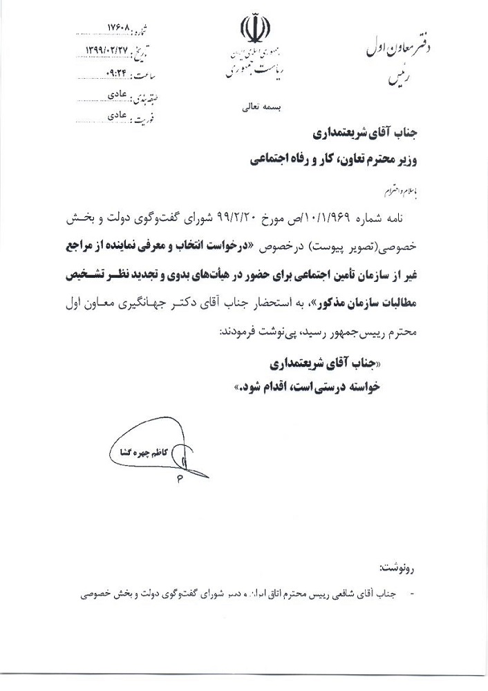 هفته گذشته، رئیس اتاق ایران در نامهای به اسحاق جهانگیری، معاون اول رئیسجمهوری، تغییر در ترکیب هیاتهای بدوی و تجدیدنظر تشخیص مطالبات تأمین اجتماعی را خواستار شده بود و جهانگیری ضمن موافقت با این خواسته و درست دانستن آن، به وزیر کار دستور داد در راستای رسیدگی به این درخواست اقدام کند.