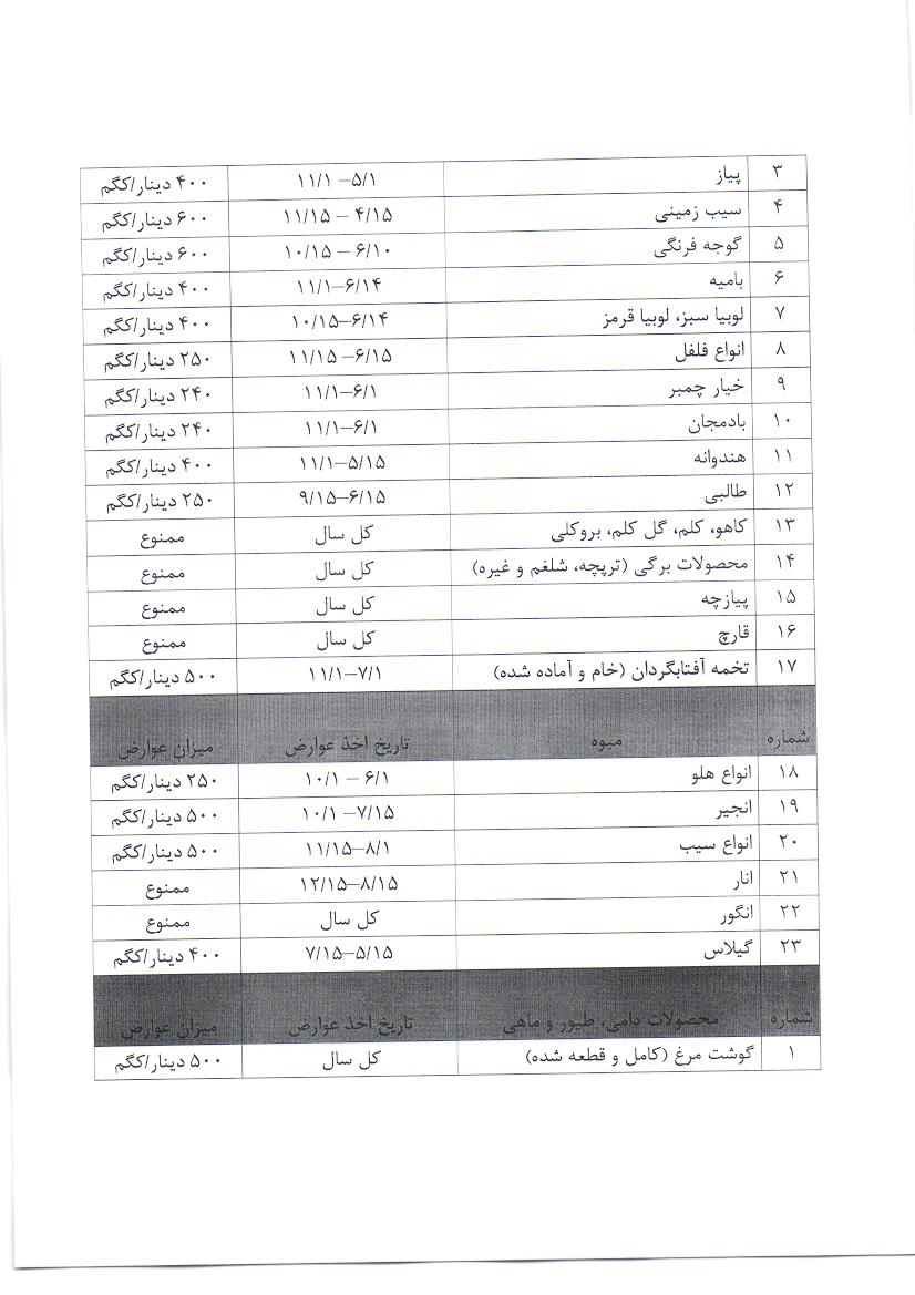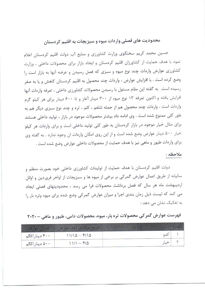 جدول زمانبندی اجرای عوارض گمرکی وضع شده بر میوه و تره بار برای سال 2020 میلادی در اقلیم کردستان