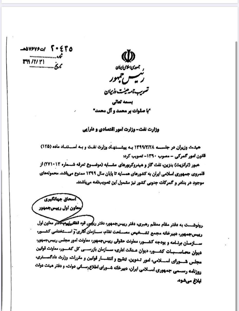 ترانزیت بنزین ، نفت گاز و هیدروکربورهای مشابه( موضوع تعرفه شماره 271012) از قلمروی جمهوری اسلامی ایران به کشورهای همسایه تا پایان سال 1399 ممنوع شد.