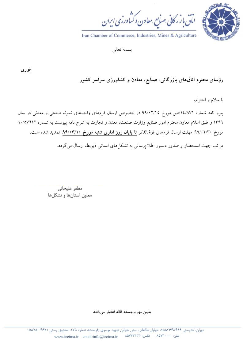 تمدید مهلت ارسال فرم های انتخاب واحدهای نمونه صنعتی و معدنی در سال 99