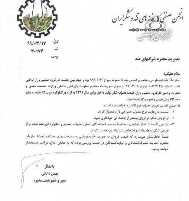 قیمت جدید شکر سفید ۶۳۰۰ تومان برای فروش درب کارخانه به تولیدکنندگان این محصول ابلاغ شد.